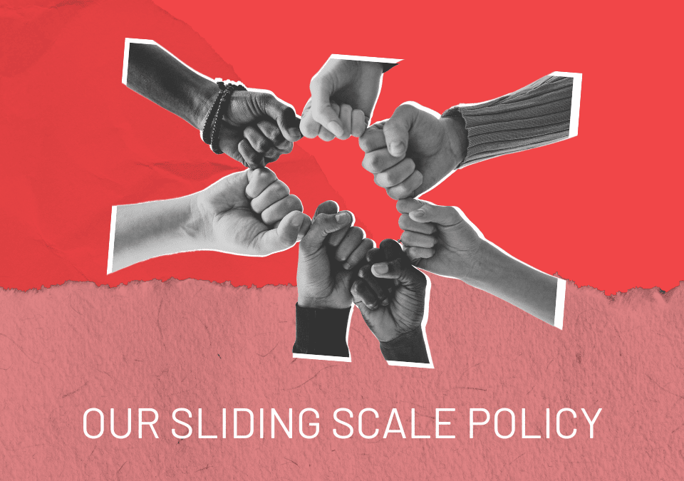 Sliding scales ask you to examine your own financial resources and access to privilege so that we can create access for people whose identities and access to wealth and income have been limited due to their gender expression, racial identity, sexual orientation, lived experiences, and more.